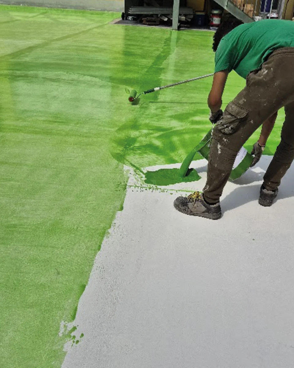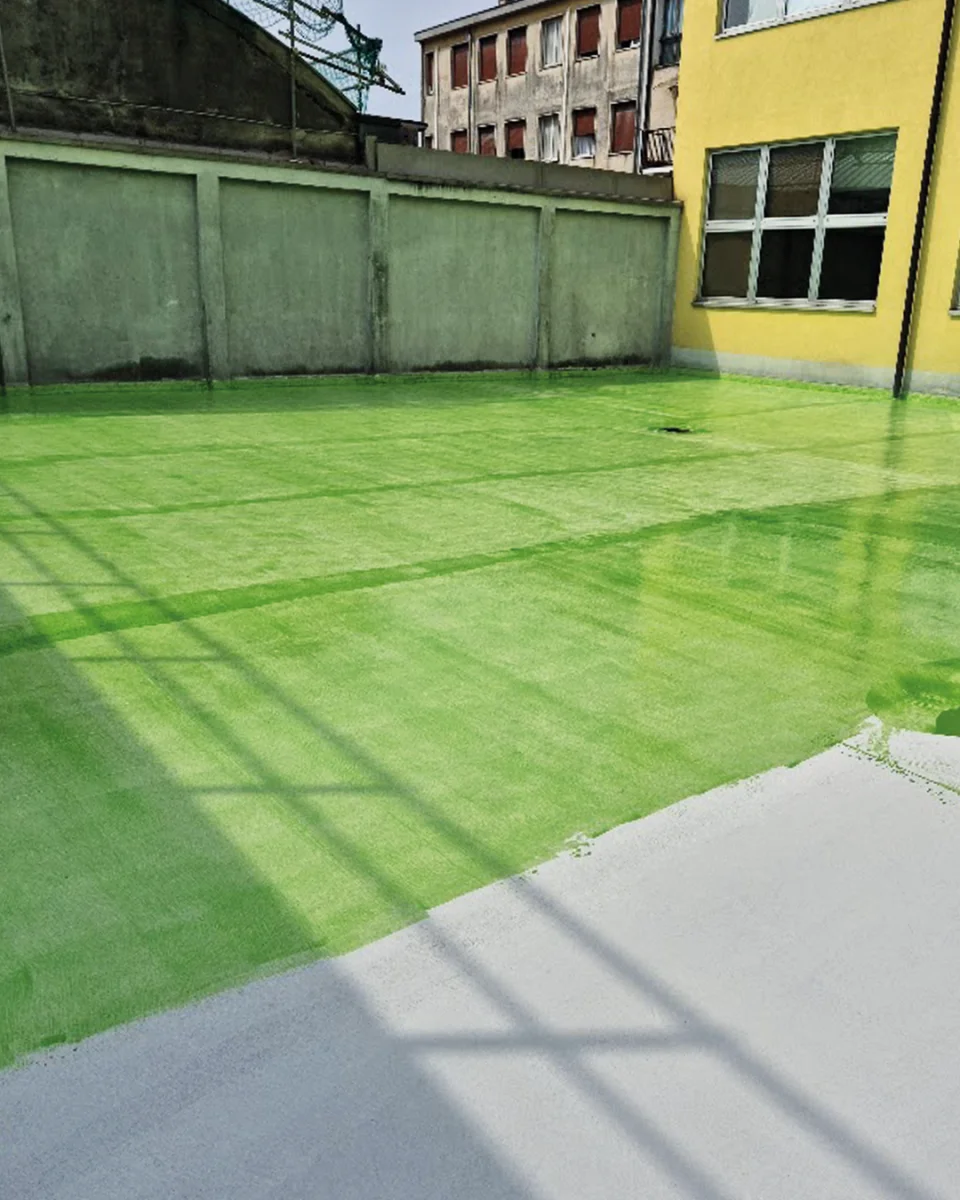 Primer verde: successivamente, è stato applicato un primer verde, formulato per favorire l’ancoraggio del sistema di impermeabilizzazione al supporto, garantendo stabilità e durabilità nel tempo.