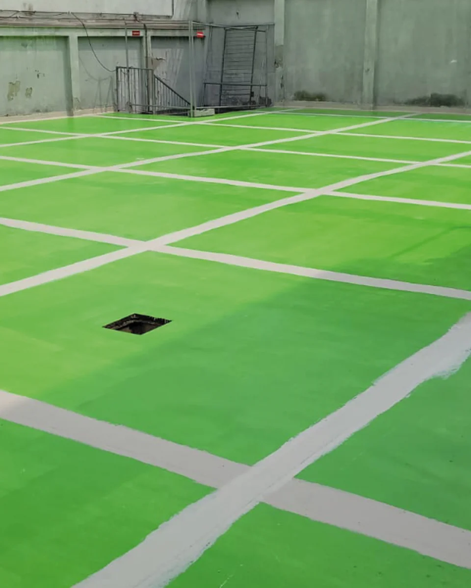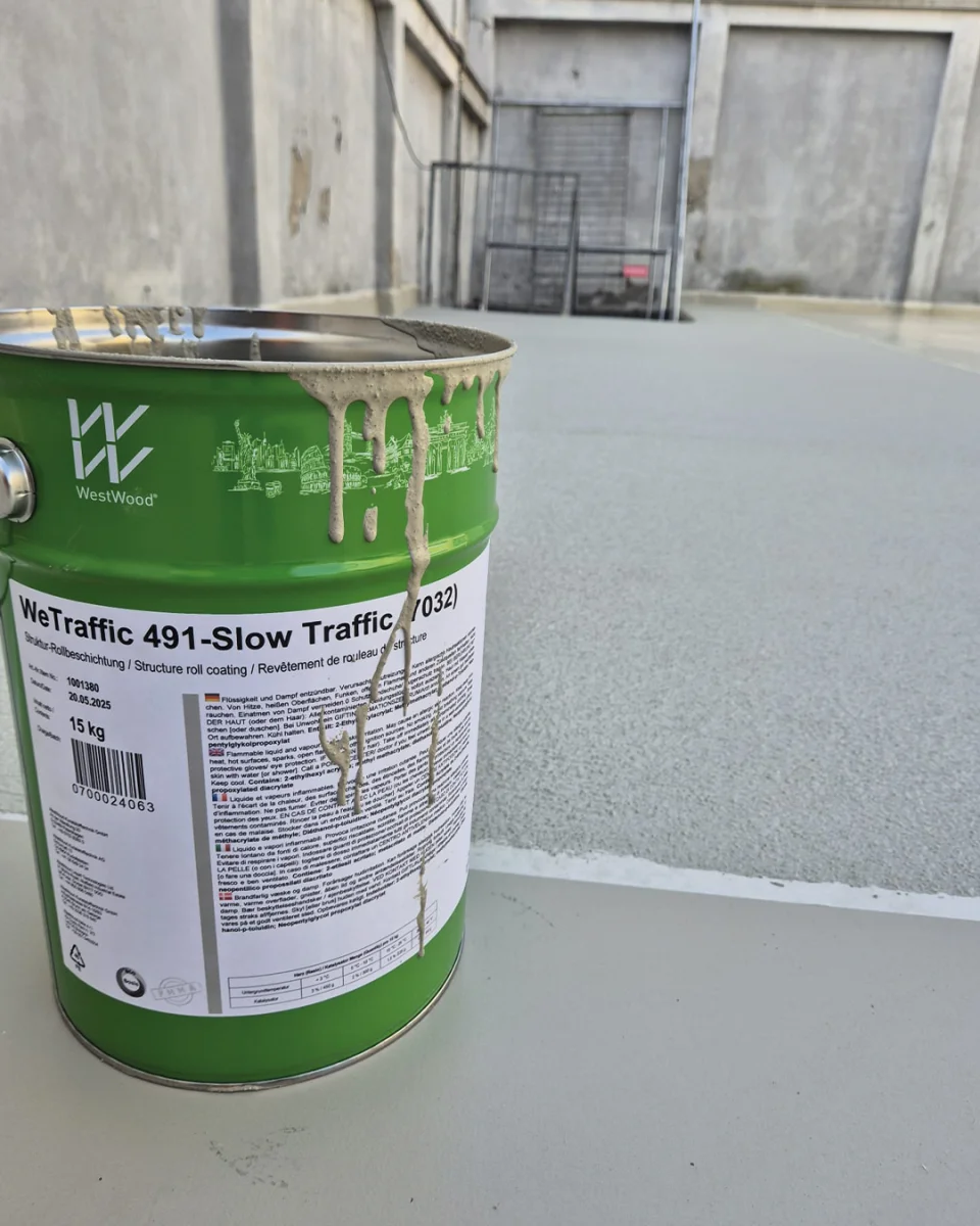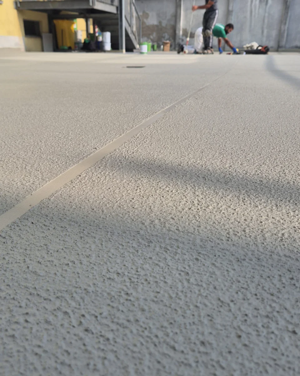 Autolivellante impermeabile: è stato applicato un strato di malta autolivellante a base di metacrilato, con elevata adesione e capacità di assorbire leggere deformazioni del supporto, realizzando una superficie uniforme e resistente all’acqua.